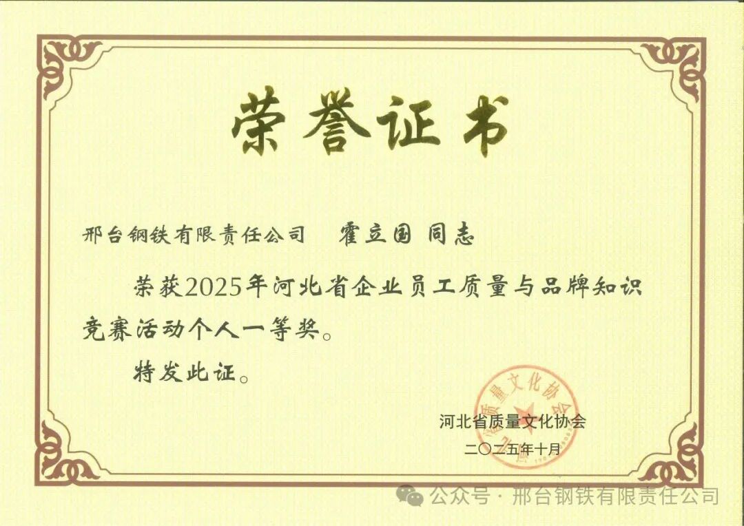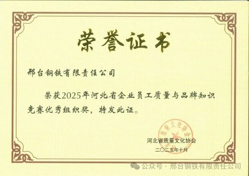 近日,2025年河北省企業(yè)員工質(zhì)量與品牌知識(shí)競(jìng)賽結(jié)果揭曉,邢臺(tái)鋼鐵有限責(zé)任公司憑借出色的組織工作和員工優(yōu)異的答題表現(xiàn),榮獲“優(yōu)秀組織獎(jiǎng)”,6名員工分獲個(gè)人一、二、三等獎(jiǎng)。