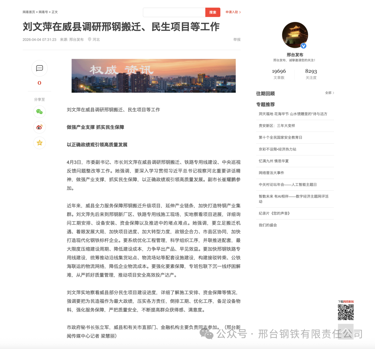 近年來,威縣全力服務(wù)保障邢鋼搬遷升級(jí)項(xiàng)目,延伸產(chǎn)業(yè)鏈條,加快打造特鋼產(chǎn)業(yè)集群。劉文萍先后來到邢鋼新廠區(qū)、鐵路專用線施工現(xiàn)場(chǎng),實(shí)地察看項(xiàng)目進(jìn)展,詳細(xì)詢問工期安排、設(shè)備安裝、資金保障以及推進(jìn)中的堵點(diǎn)難點(diǎn)。她強(qiáng)調(diào),要立足搬遷機(jī)遇、著眼發(fā)展大局,加快項(xiàng)目進(jìn)度、加大轉(zhuǎn)型力度,政銀企合力、市縣區(qū)協(xié)同,加快打造現(xiàn)代化鋼鐵標(biāo)桿企業(yè)。要系統(tǒng)優(yōu)化工程管理,科學(xué)組織工序,并聯(lián)推進(jìn)配套,最大限度壓縮建設(shè)周期、降低建設(shè)成本,力爭(zhēng)早出產(chǎn)品、早見效益。要加快邢鋼鐵路專用線建設(shè),統(tǒng)籌推動(dòng)沿線集貨站點(diǎn)、物流場(chǎng)站等配套設(shè)施建設(shè),構(gòu)建接駁轉(zhuǎn)乘、公鐵海聯(lián)運(yùn)的物流網(wǎng)絡(luò),降低企業(yè)物流成本。要強(qiáng)化要素保障,專班包聯(lián)下沉一線紓困解難,從嚴(yán)抓好質(zhì)量管理,推動(dòng)項(xiàng)目安全高效投產(chǎn)達(dá)產(chǎn)。     劉文萍實(shí)地察看威縣部分民生項(xiàng)目建設(shè)進(jìn)度,詳細(xì)了解施工安排、資金保障等情況,強(qiáng)調(diào)要把為民造福作為最大政績(jī),壓實(shí)各方責(zé)任,倒排工期、優(yōu)化工序,備足設(shè)備物料,強(qiáng)化服務(wù)保障,嚴(yán)把質(zhì)量安全,不斷提高群眾獲得感、滿意度。